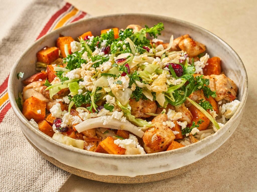 4. Monte as tigelas: coloque uma porção de arroz, adicione o frango e a batata-doce assados por cima, finalize com a salada de couve e o queijo feta.