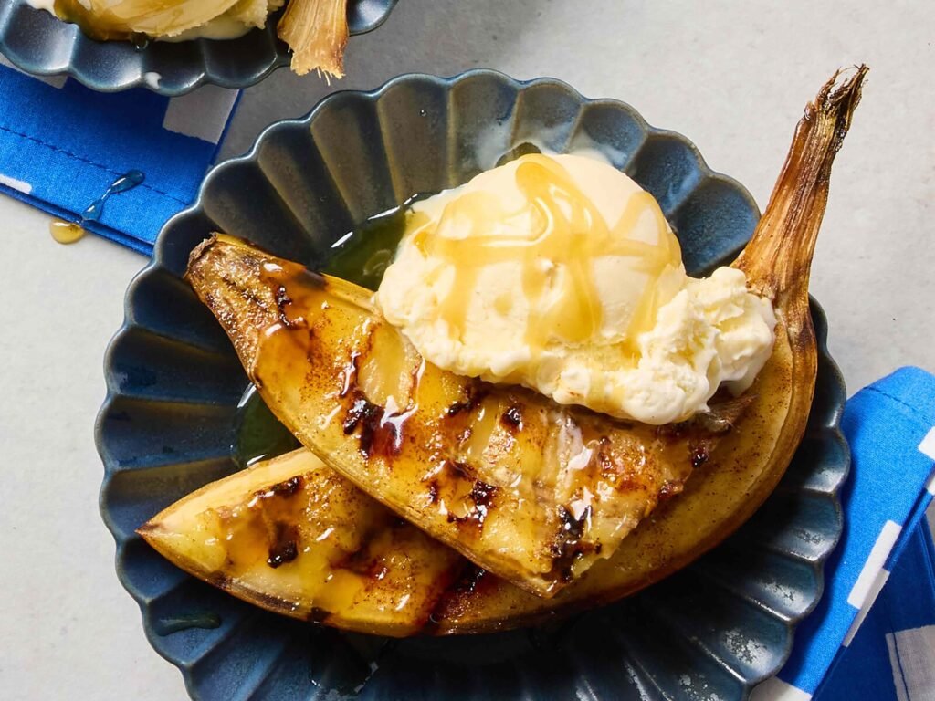 Sirva as bananas grelhadas com flocos de coco torrados e uma bola de sorvete de creme.