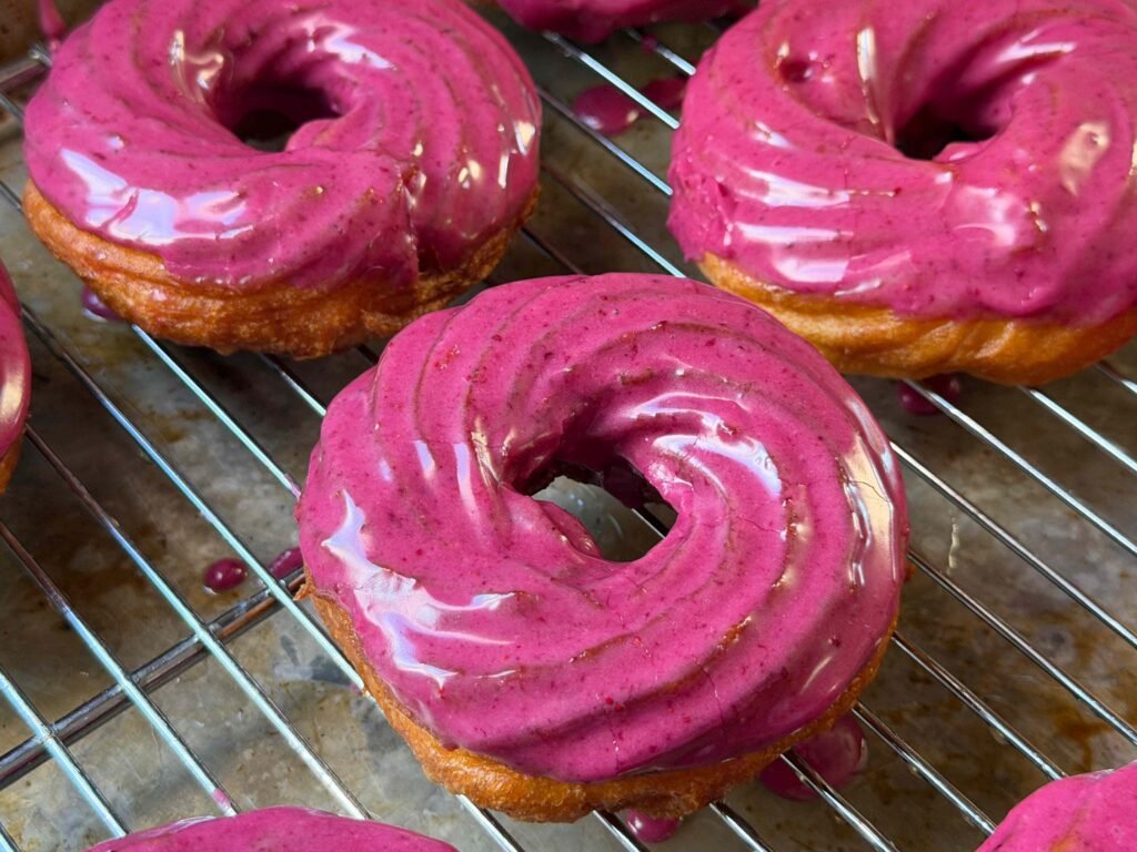 Esses crullers de limão com blueberry são uma verdadeira delícia que combina o melhor dos sabores cítricos com a doçura das frutas. A primeira mordida revela uma crocância incrível por fora, enquanto o interior de choux proporciona uma leveza envolvente. Com uma cobertura rosa vibrante, esses doces não são apenas saborosos, mas também visualmente impressionantes.