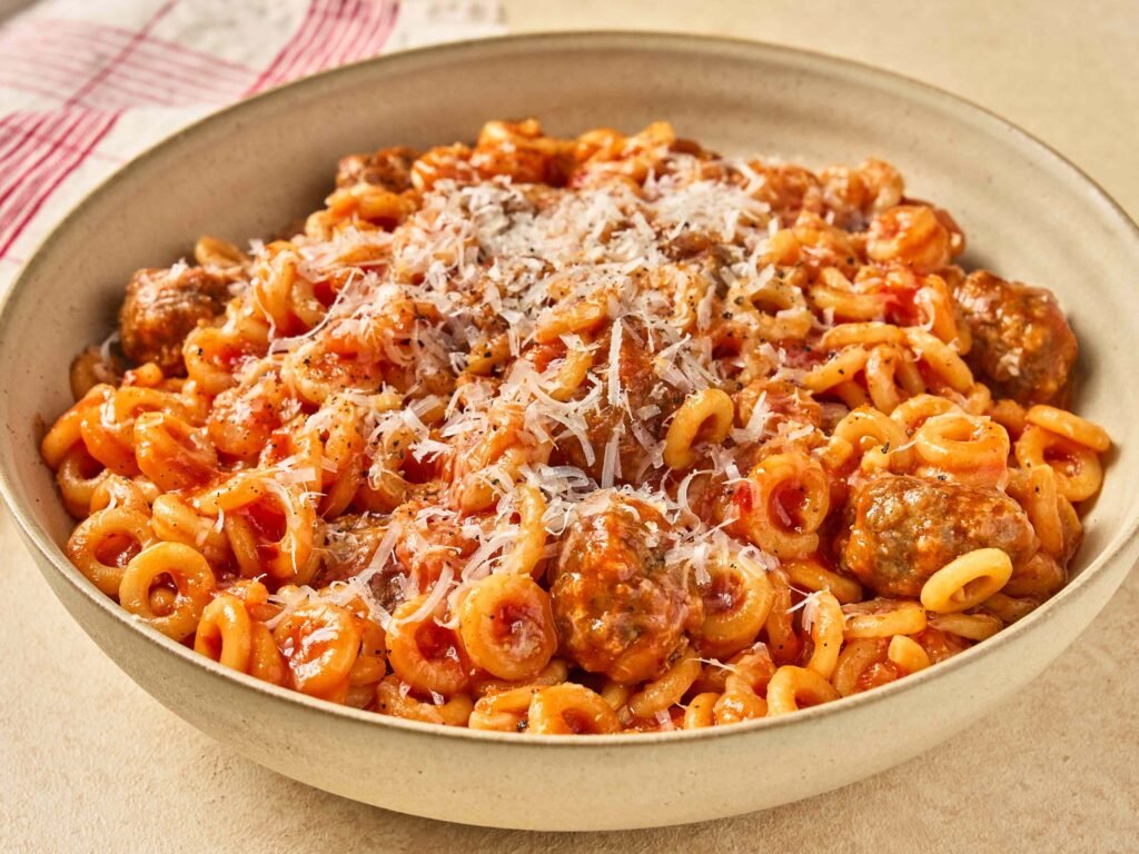 Esta receita moderna de SpaghettiOs traz à tona boas lembranças da infância, mas com uma pegada mais sofisticada. Ao invés de ingredientes processados, aqui utilizamos bolinhos de carne caseiros, o formato divertido da massa anelletti e um molho de tomate leve e saboroso. É uma combinação que promete conquistar tanto os adultos quanto as crianças.